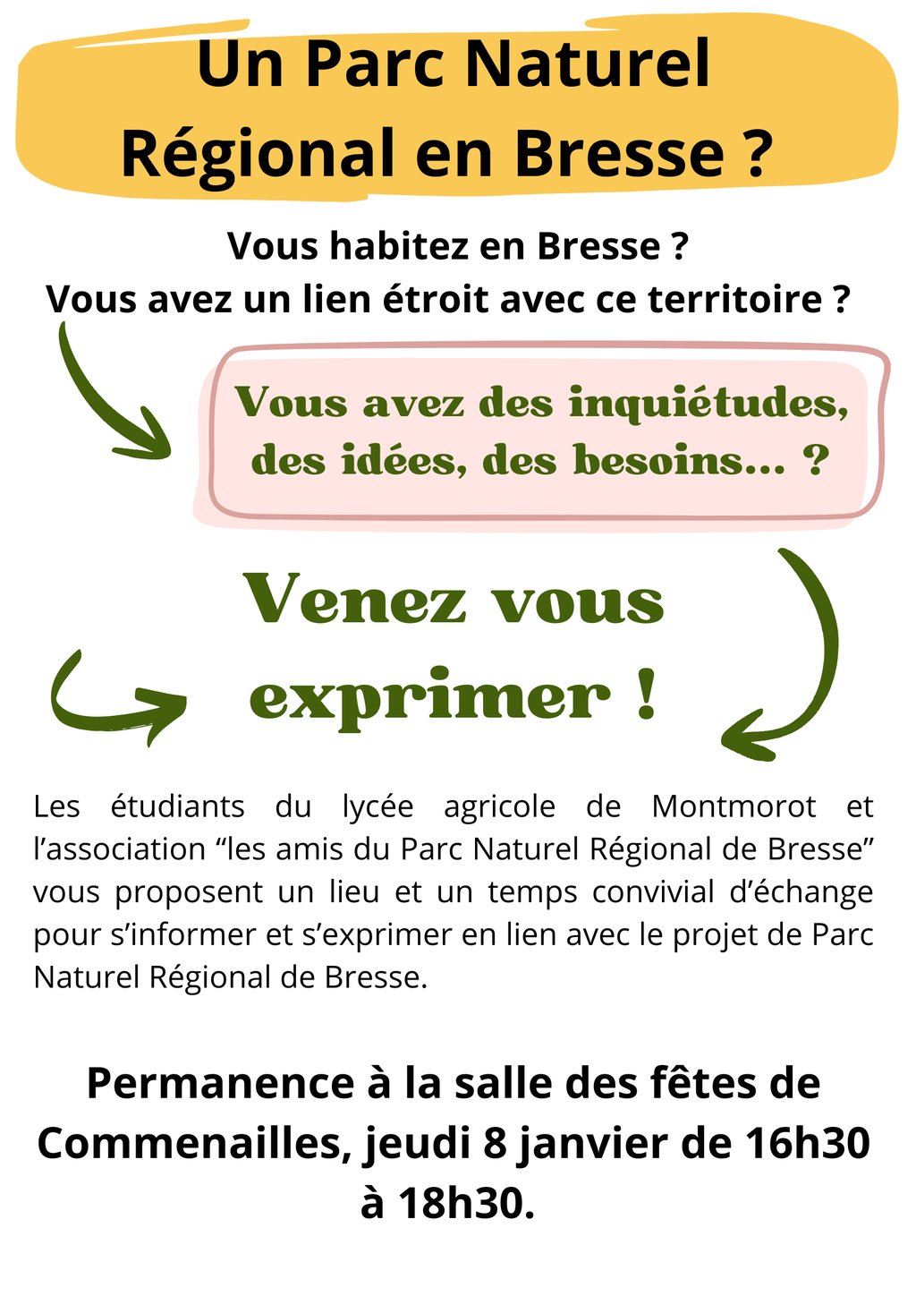 Si vous habitez en Bresse, si vous avez un lien étroit avec ce territoire, ou tout simplement si vous avez envie d’échanger et vous exprimer en lien avec le sujet du PNR de Bresse, n’hésitez pas à venir exprimer votre avis, vos inquiétudes, vos idées… à travers notre enquête et autour d’un verre de l’amitié :