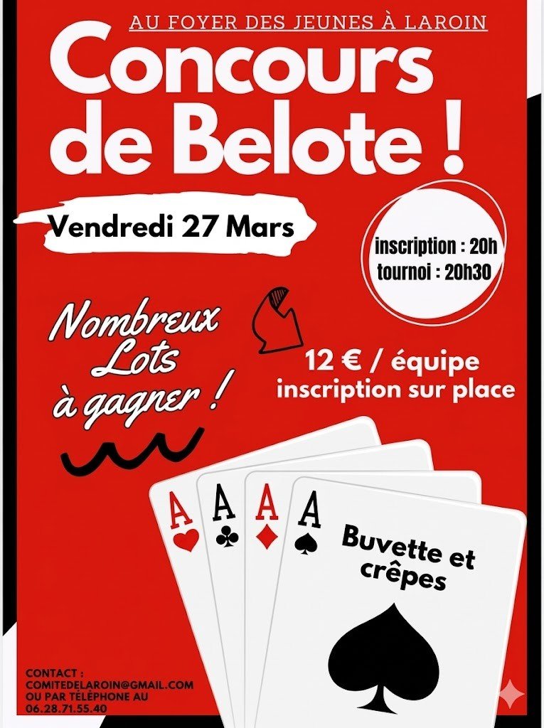 Le Comité des fêtes organise un concours de belote le vendredi 27 mars à 20h au foyer des jeunes à Laroin.