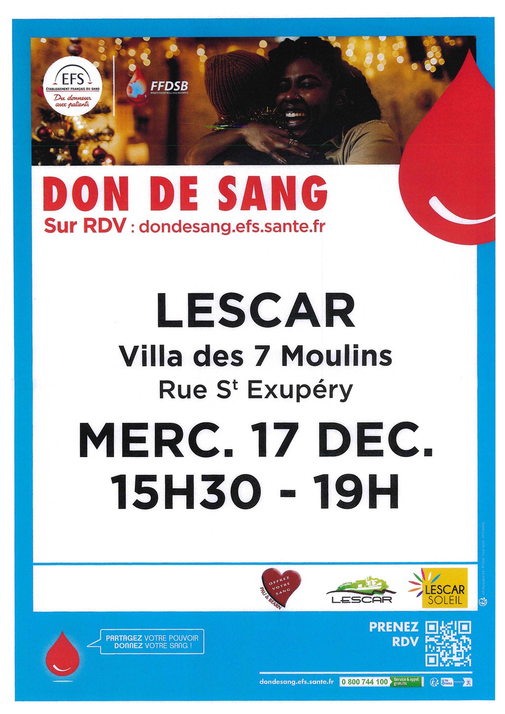 DON DU SANG MERCREDI 17 DÉCEMBRE À LESCAR.