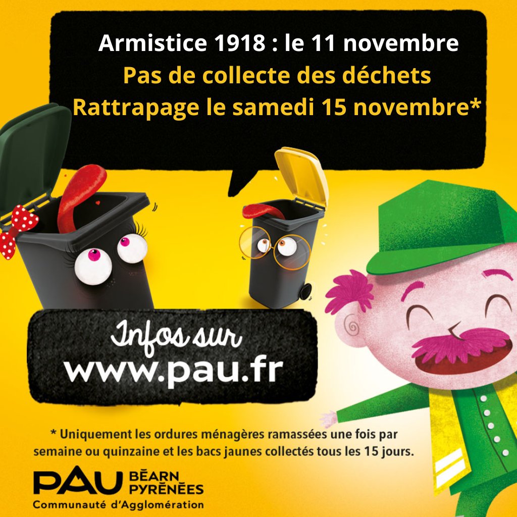 Le mardi 11 novembre étant férié, la collecte hebdomadaire du bac à ordures ménagères et la collecte bimensuelle du bac jaune sont déplacées au samedi 15 novembre à Laroin,