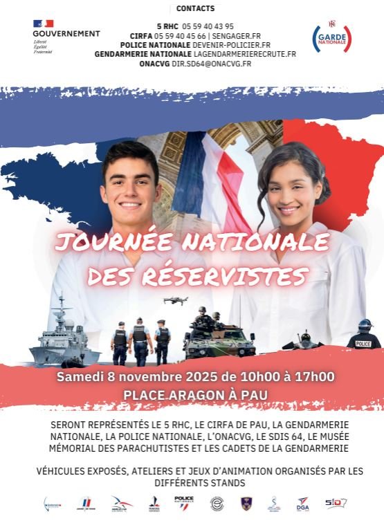 Le samedi 8 novembre 2025, de 10h00 à 17h00, se tient la journée nationale des réservistes au square George V Aragon, boulevard des Pyrénées à Pau.