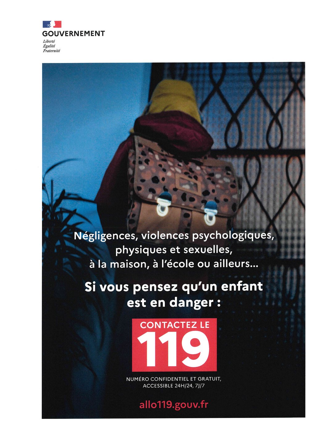 Déployée à l’échelle nationale, cette campagne encourage le passage à l’action en faisant connaître le 119, numéro national d’appel et site web de l’enfance en danger (www.allo119.gouv.fr), confidentiel, gratuit et accessible 24h/24, 7j/7, pour toute information sur le 119, avec possibilité de remplir un formulaire en ligne et de converser par tchat pour les moins de 21 ans. Au-delà de son rôle clé de prévention, d’orientation et de transmission vers les services compétents pour protéger les mineurs, le 119 est un espace d’écoute et de conseil, qui peut être sollicité même en l’absence de certitude. L’alerte est un levier essentiel de la protection des enfants contre les violences.