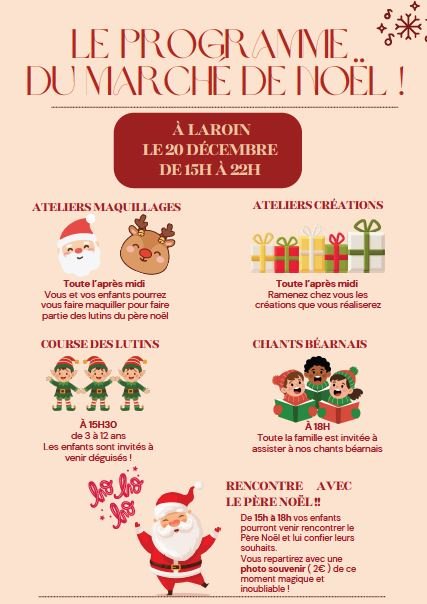 Le comitĂ© des FĂȘtes de Laroin et la Peña LatĂ©couĂšre organisateurs de ce marchĂ© de NoĂ«l comptent sur vous pour faire de cette premiĂšre Ă©dition, un moment festif et chaleureux !