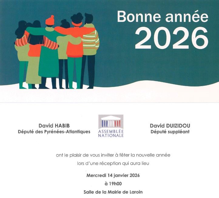 David Habib, Député et son suppléant David Duizidou, vous invitent à fêter la nouvelle année le mercredi 14 janvier 2026 à 19h à la Mairie de Laroin.