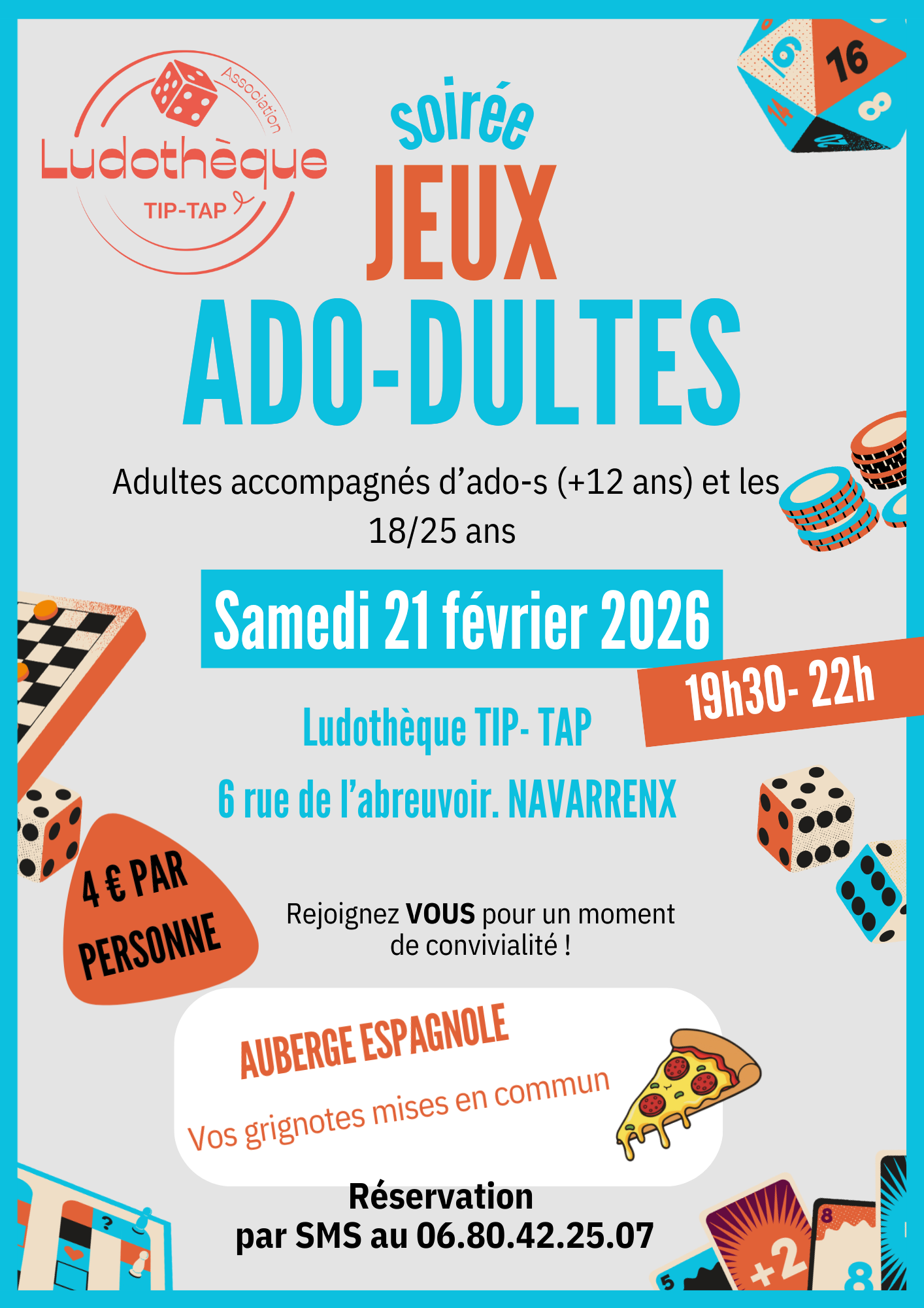 Rejoignez VOUS sur ce temps de jeux dédié spécialement aux adultes accompagnés d'ados et aux jeunes de 18/25 ans.  C'est une première !!!! Réservez vos places par SMS au 06 80 42 25 07