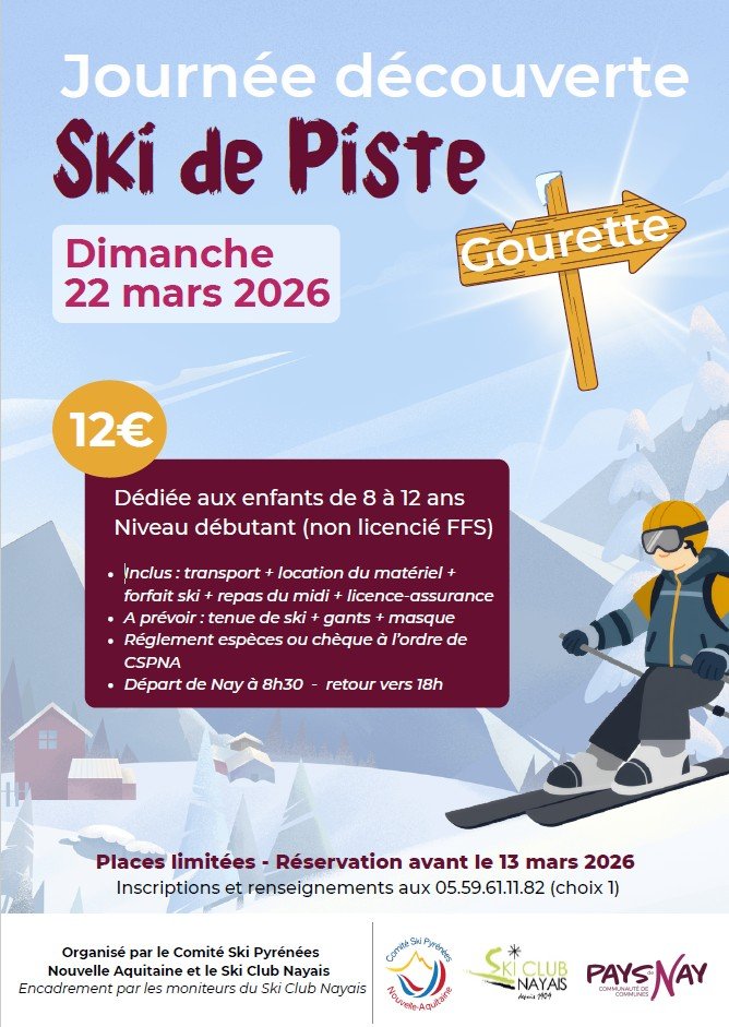 Le Comité Ski Pyrénées Nouvelle-Aquitaine avec le soutien du Ski Club Nayais organise une journée de découverte du ski à Gourette le dimanche 22 mars 2026 pour les enfants de 8 à 12 ans n’ayant jamais pratiqué de ski.