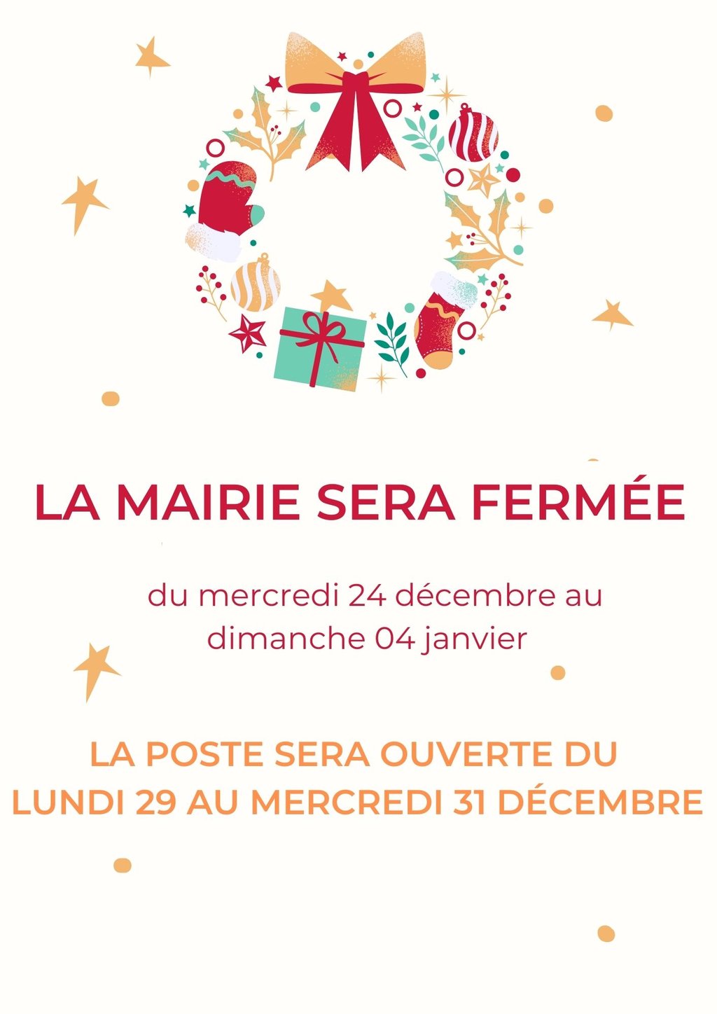 La mairie sera fermée du 24 décembre 2025 au 04 janvier 2026.