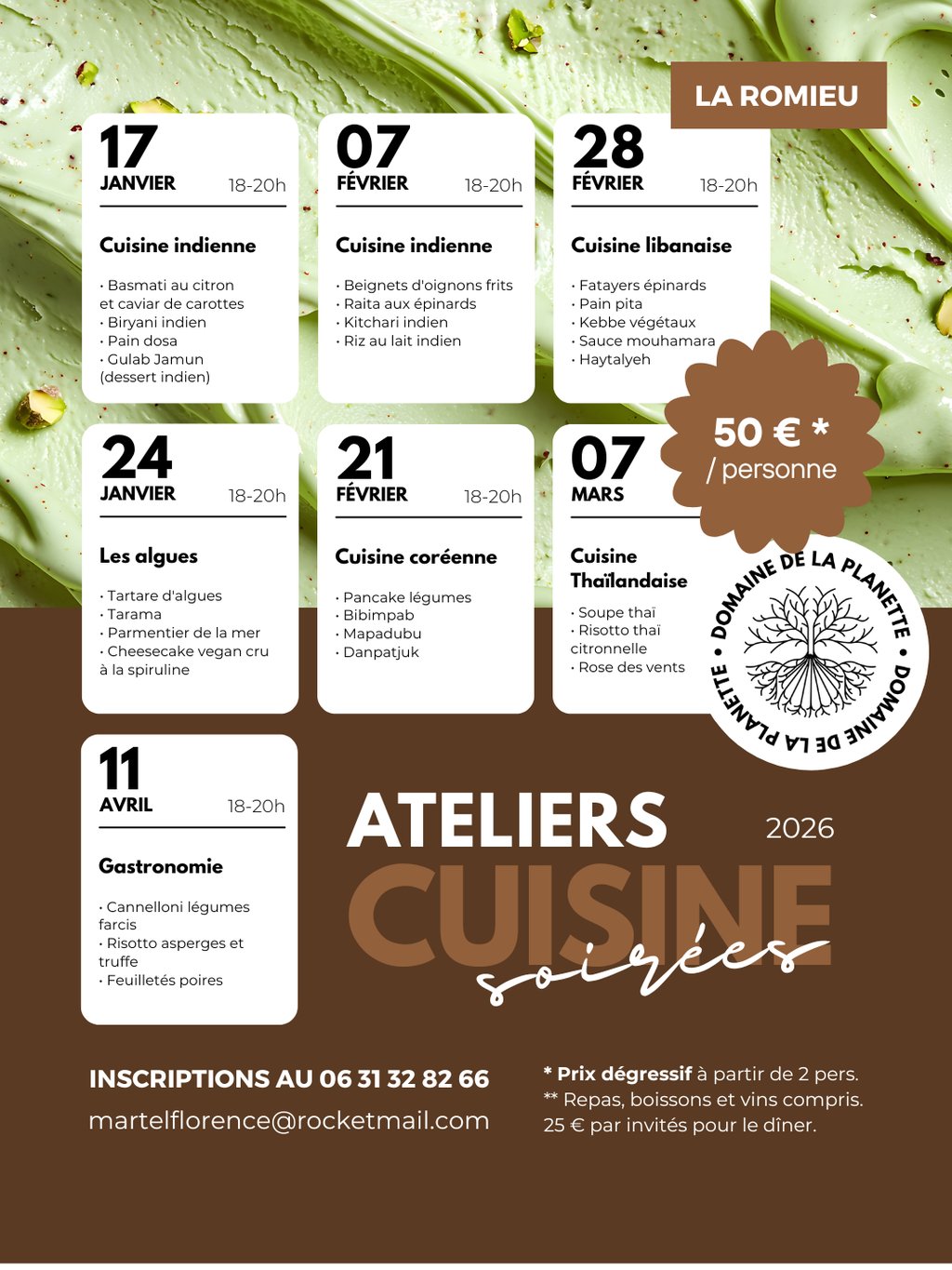 Programme des ateliers et stage de cuisine végétale à La Planette.