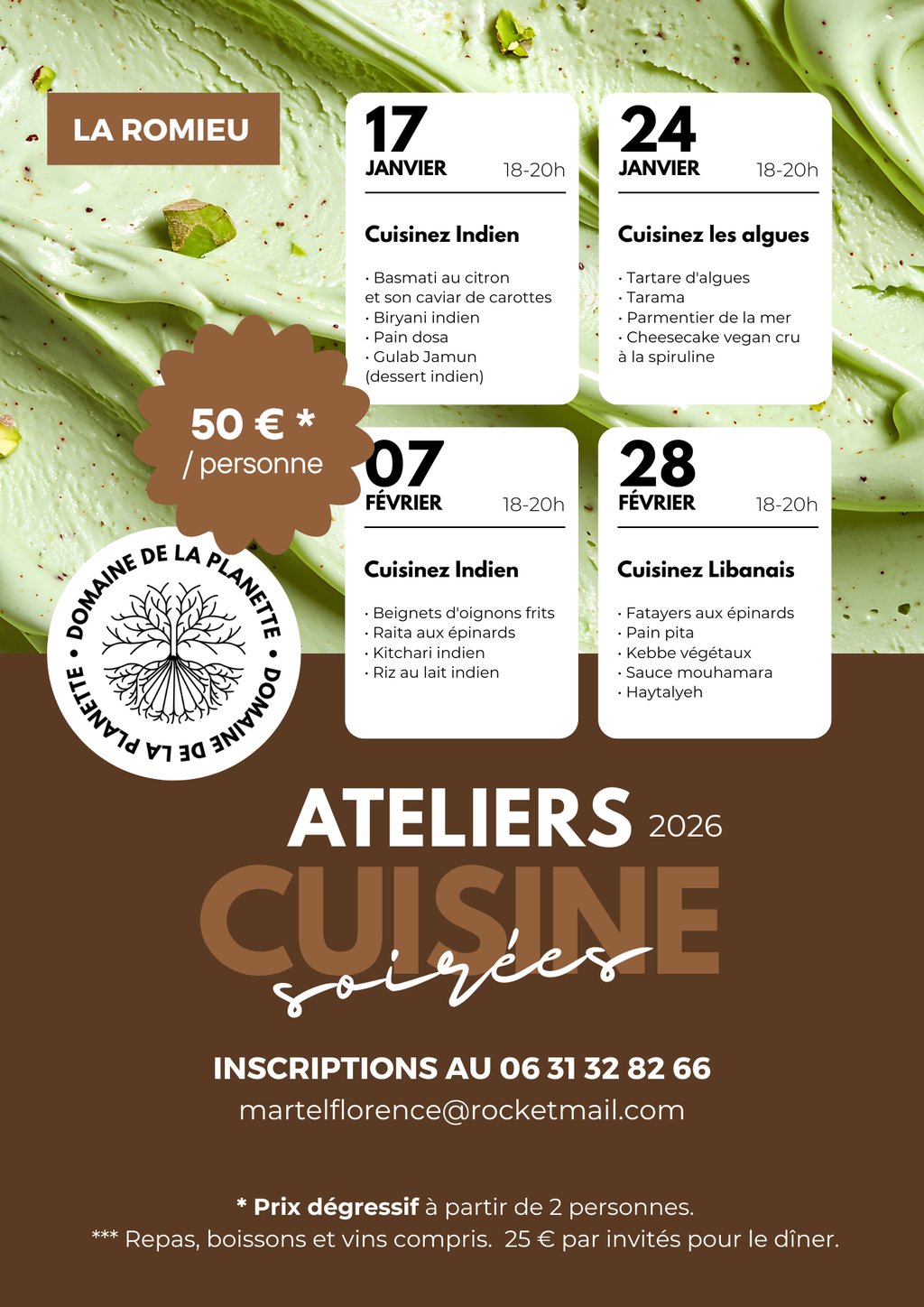 Le Domaine de la Planette vous propose une série d’ateliers cuisine en soirée pour bien débuter l’année 2026.