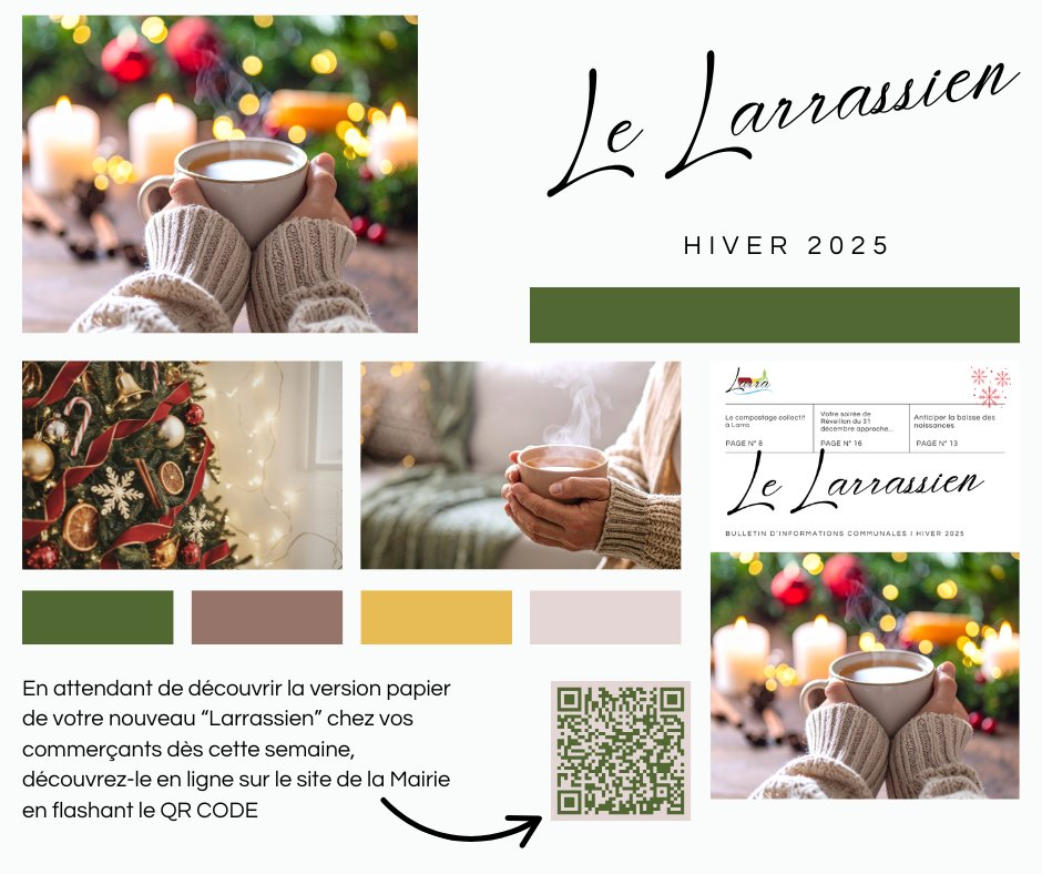 Votre bulletin municipal spécial "Hiver 2025" sort plus tôt cette année. Découvrez-le en ligne en scannant le QR code ou retrouvez sa version papier chez vos commerçants, mairie et médiathèque de Larra.