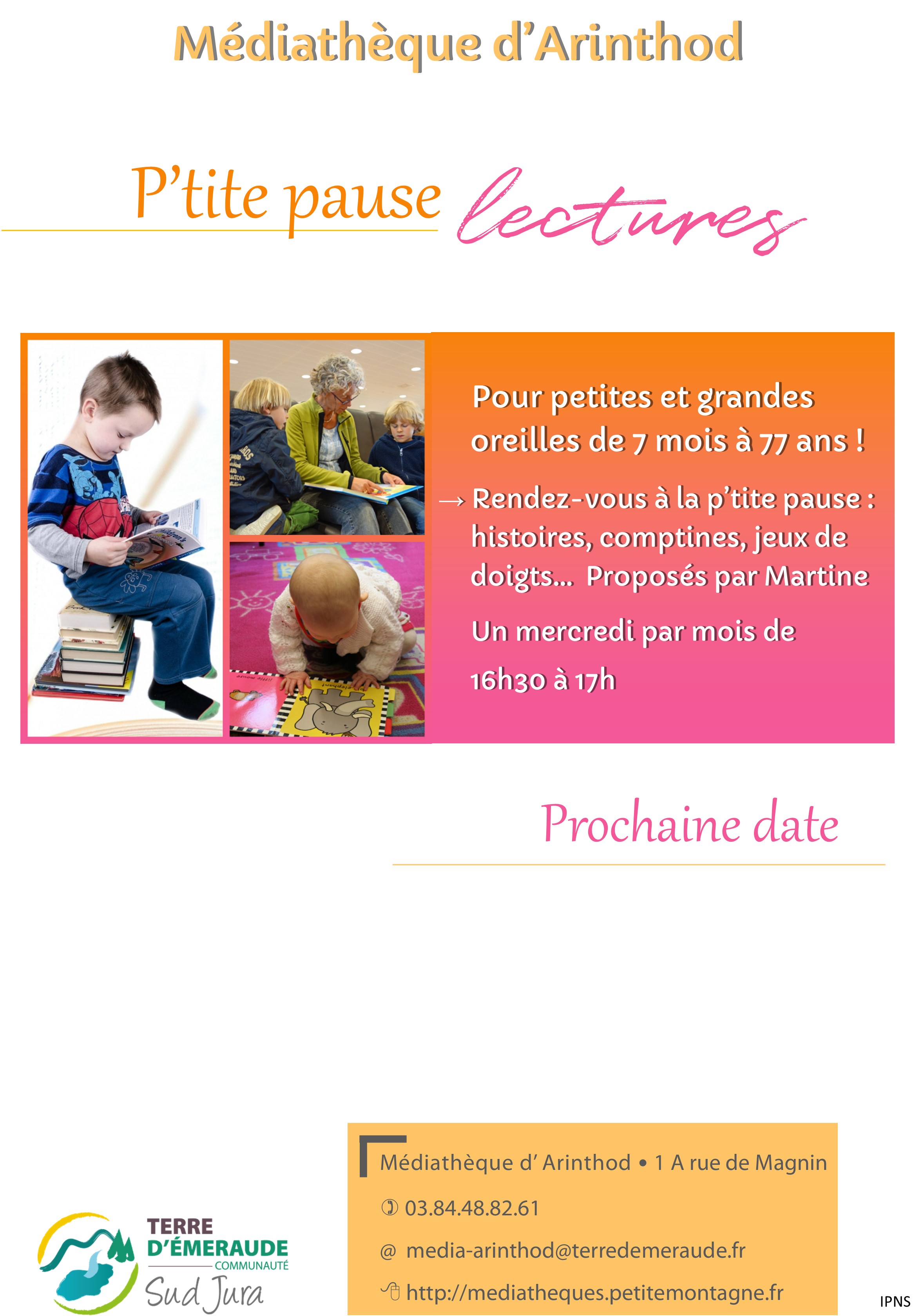 A la médiathèque d'Arinthod, on prend le temps de se détendre pour écouter des histoires. Martine proposera une "p'tite pause lecture" le mercredi 14 janvier, de 16h30 à 17h, pour petites et grandes oreilles. Tout public. Gratuit. Réservation conseillée.