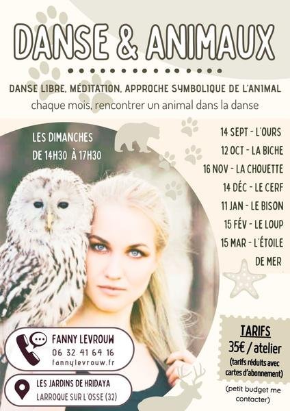 Chaque atelier est pensé comme une exploration en mouvement, un voyage intérieur rythmé par des temps de danse libre, de connexion à soi, de créativité, d'écoute et de partage. Nous pourrons ainsi nous laisser inspirer par chaque animal, et recevoir leurs messages à travers les différentes pratiques proposées.