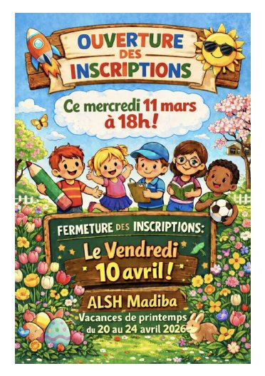 L'ouverture des inscriptions pour les vacances de Pâques à l'espace Madiba se fera du mercredi 11 mars au vendredi 10 avril.