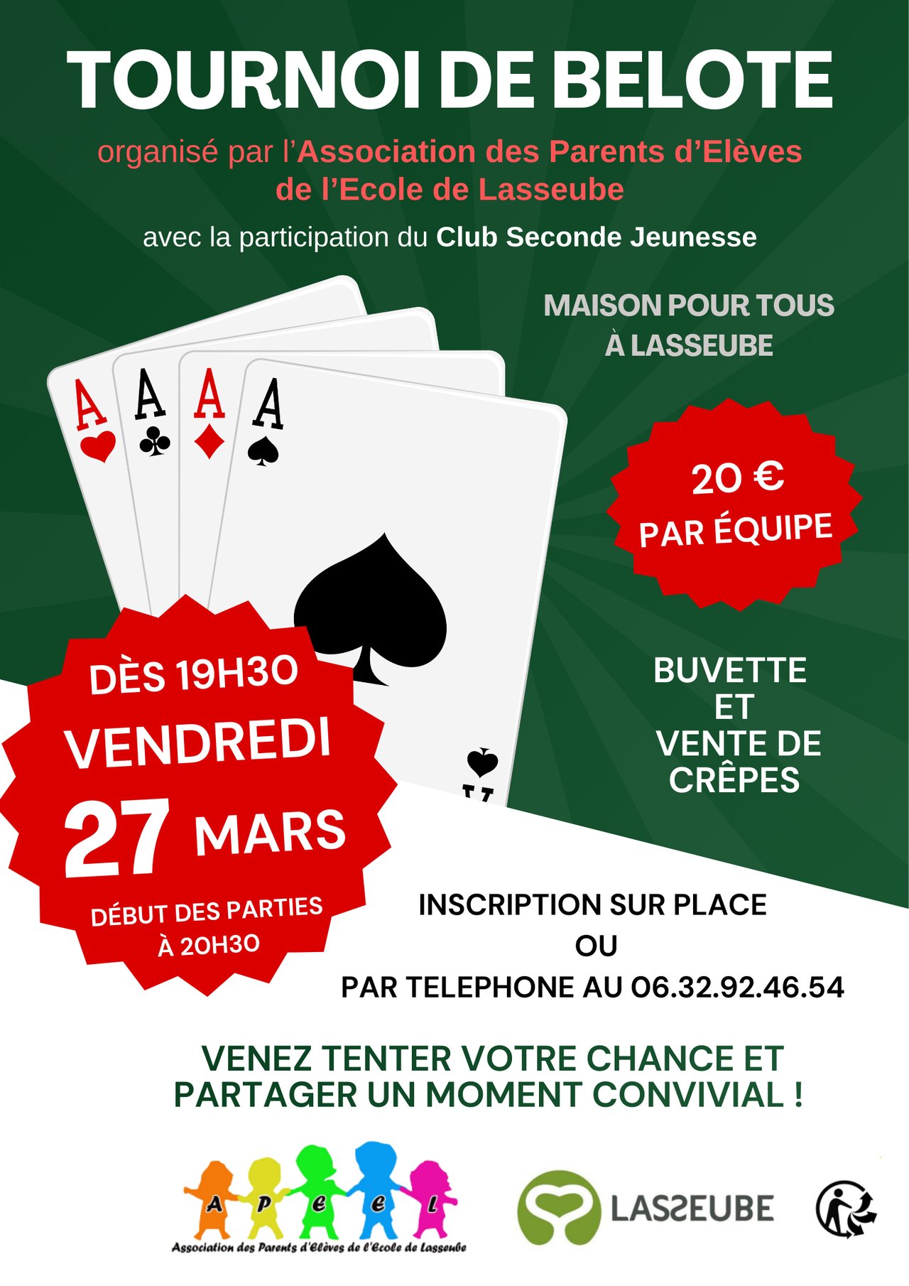 L’Association des Parents d’Élèves de l’École de Lasseube, avec la participation du Club Seconde Jeunesse, vous invite à une soirée conviviale autour d’un grand Tournoi de Belote !