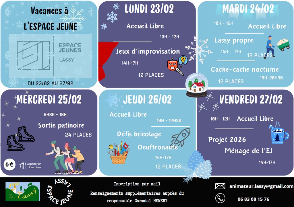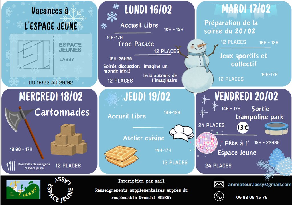 Vous trouverez ci-joint le programme des activités organisées par l'espace jeunes durant les prochaines vacances de février.