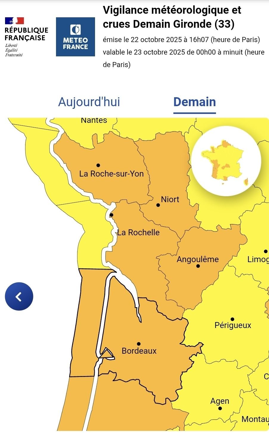 En fin de nuit de mercredi à jeudi, à partir de jeudi matin à 6h, les départements côtiers sont placés en vigilance orange avec des rafales de 100 à 120 km/h voire localement 130 km/h prévues sur le littoral atlantique. De fortes averses parviennent à rentrer dans les terres, pouvant occasionner des rafales entre 90 à 100 km/h voire ponctuellement 110 km/h.