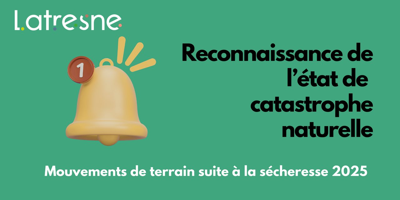 Latresne a été reconnue en état de catastrophe naturelle par arrêté interministériel du 13 mars 2026, paru au Journal Officiel du 18 mars 2026, au titre des mouvements de terrain différentiels consécutifs à la sécheresse et à la réhydratation des sols en Gironde pour l'année 2025 (selon les périodes indiquées pour chaque commune dans l'arrêté). Si vous avez subi des dommages sur vos biens, vous avez 30 jours pour contacter votre assurance.