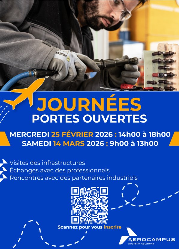 Nos journées portes ouvertes sont l’occasion idéale pour explorer AEROCAMPUS Nouvelle-Aquitaine et découvrir les formations initiales (BAC PRO, BTS, CS) que ce site unique dédié à l'apprentissage aéronautique propose.