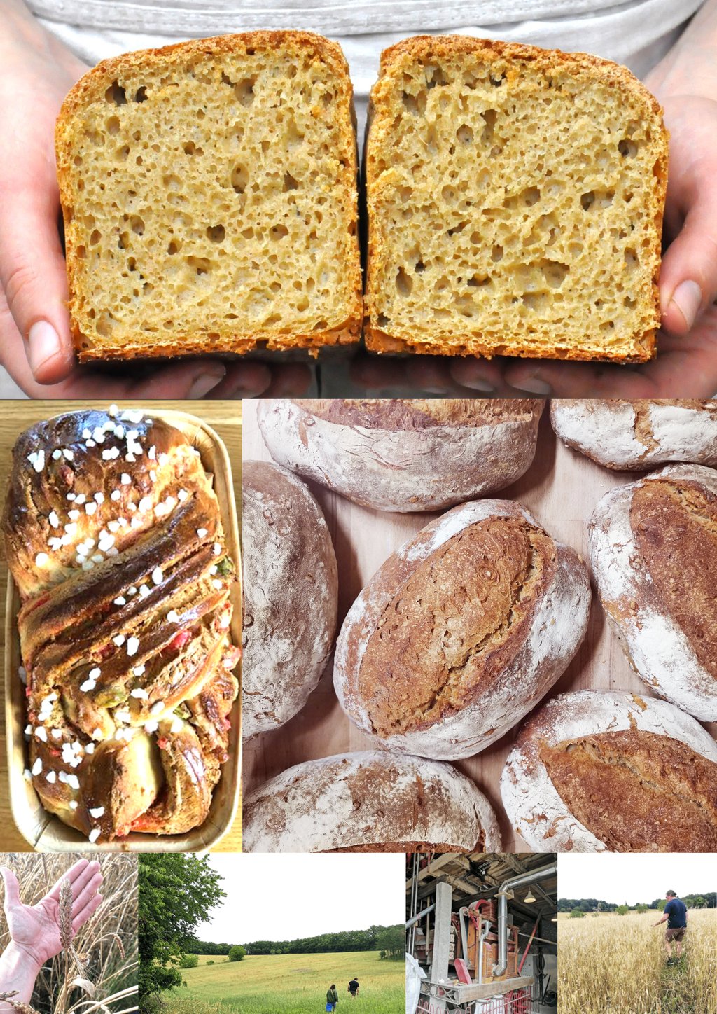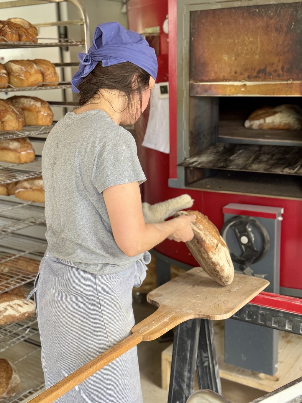 Nous produisons sur four à bois des pains au levain naturel à partir de farines biologiques, paysannes et locales, ainsi que des brioches et des biscuits.