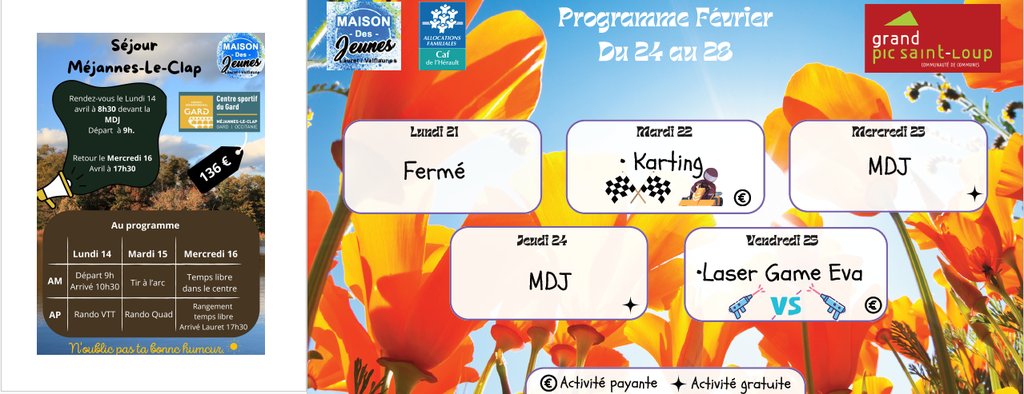 Nous prévoyons de partir en séjour à Méjannes du 14 au 16 avril. La MDJ sera donc fermée jusqu'à la fin de la semaine.