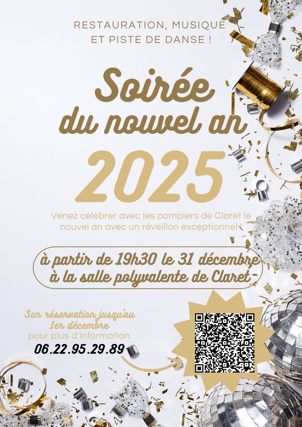 L'amicale des pompiers de Claret organise le réveillon de la Saint-Sylvestre le mercredi 31 décembre 2025 à partir de 19h30 dans la salle polyvalente de Claret.
