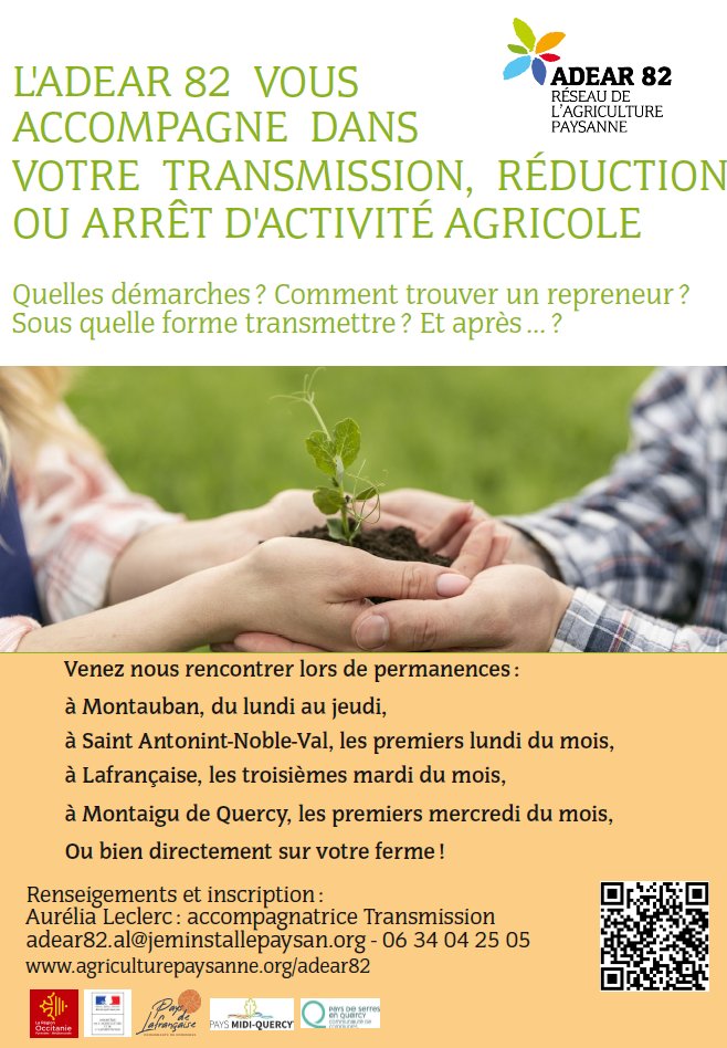 Dans le cadre de sa convention avec l’ADEAR 82, la Communauté de communes propose désormais une permanence d’accompagnement à la transmission, réduction ou cessation d’activité agricole.