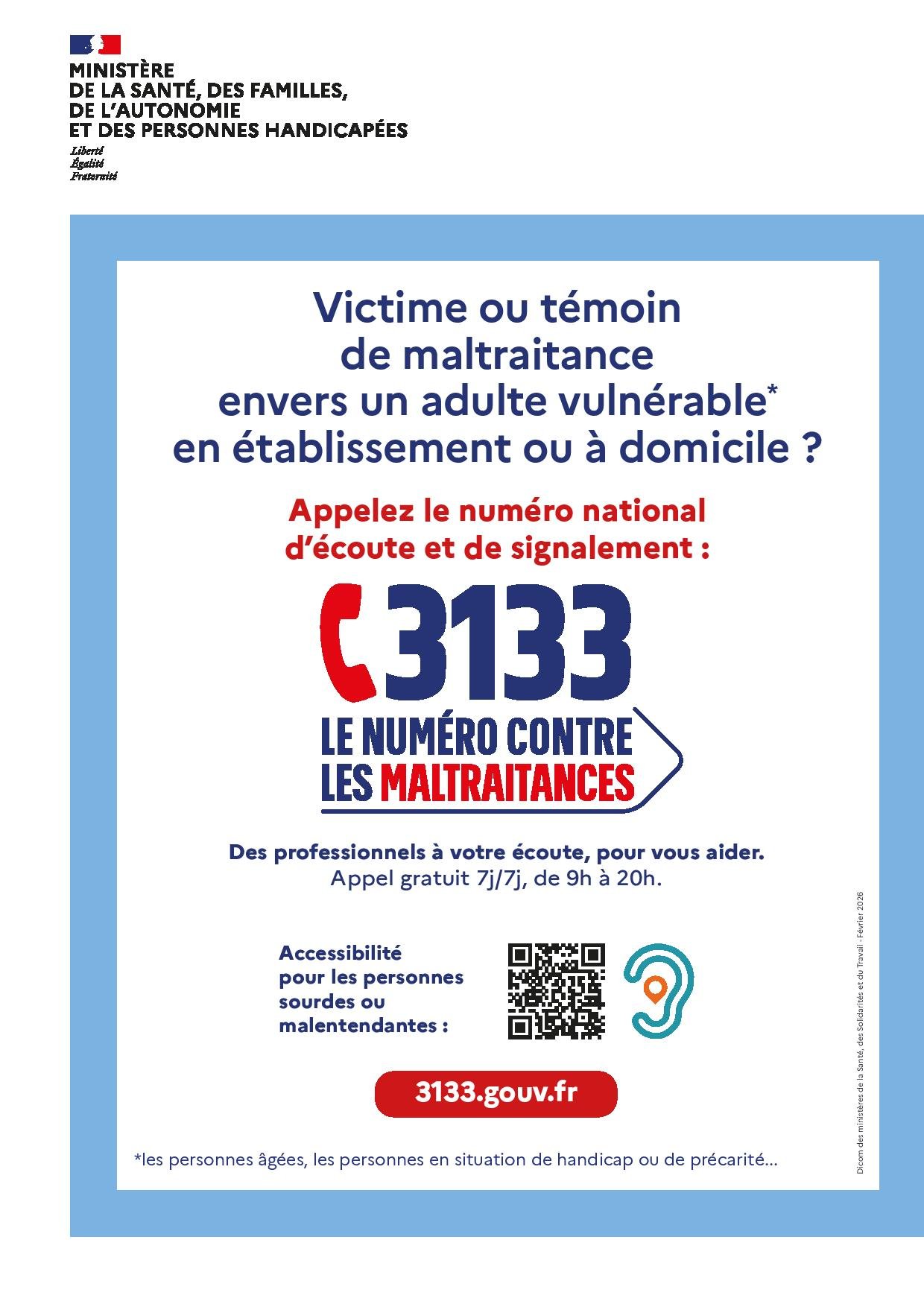 Depuis le 1er mars 2026, un nouveau service national est mis en place : le 3133, plateforme téléphonique dédiée au recueil des signalements de situations de maltraitance concernant les adultes vulnérables (personnes âgées, personnes en situation de handicap, majeurs protégés…).