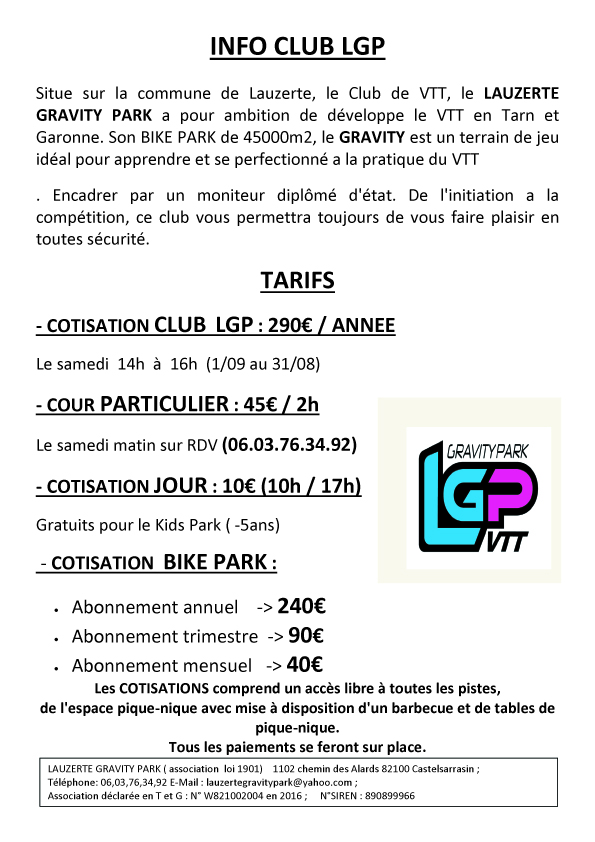 Situe sur la commune de Lauzerte, le Club de VTT, le LAUZERTE GRAVITY PARK a pour ambition de développer le VTT en Tarn-et-Garonne. Son BIKE PARK de 45000m2, le GRAVITY est un terrain de jeu idéal pour apprendre et se perfectionner à la pratique du VTT . Encadrer par un moniteur diplômé d'état. De l'initiation à la compétition, ce club vous permettra toujours de vous faire plaisir en toute sécurité.