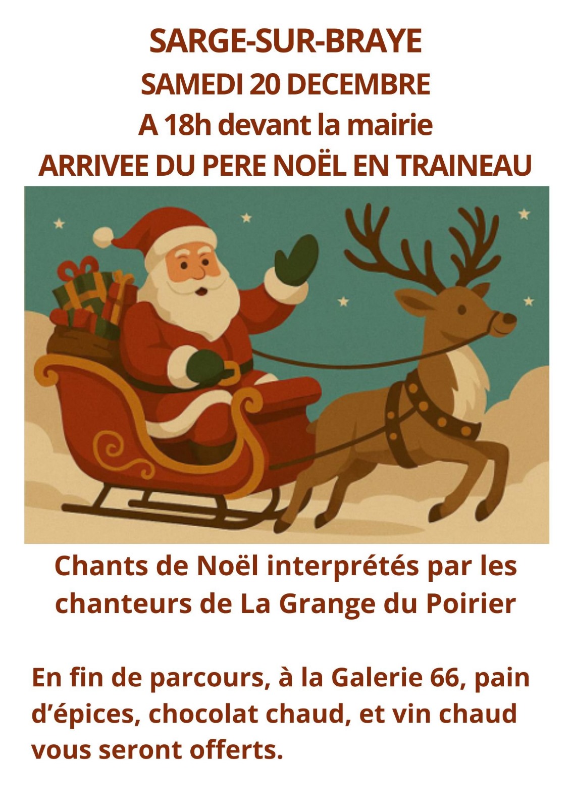 Arrivée du Père Noël en traineau devant la Mairie de Sargé sur Braye le Samedi 20 Décembre 2025 à 18 h 00.