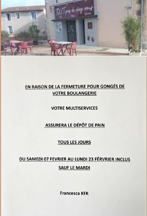 Un dépôt de pains sera assuré au multiservices durant la fermeture de la boulangerie du samedi 7 février au lundi 23 février inclus, sauf le mardi.