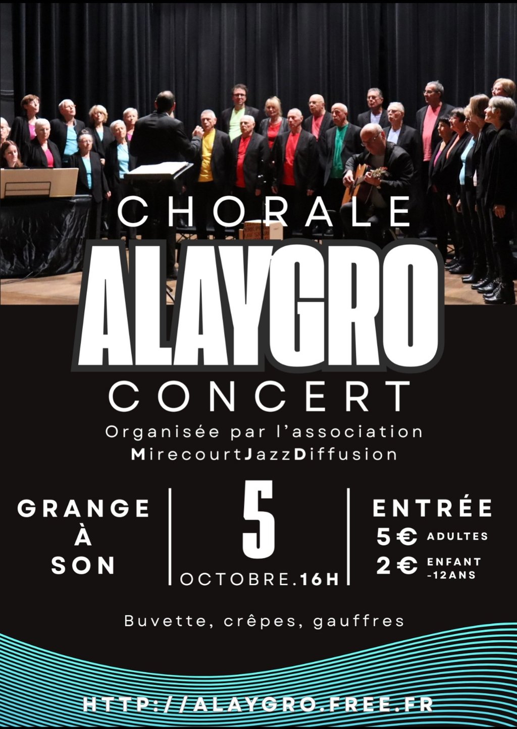 A l'invitation de Mirecourt Jazz Diffusion, la chorale ALAYGRO se produira le samedi 5 octobre à Mirecourt.