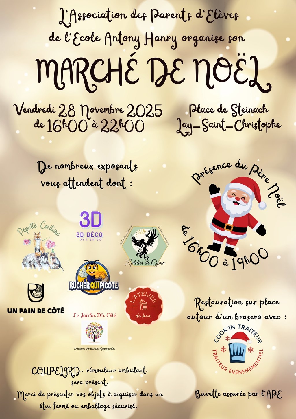 Pour la première fois, l'Association des Parents d'Elèves de l'Ecole Antony Hanry vous convie à un marché de Noël qui se déroulera Place de Steinach le vendredi 28 novembre de 16h00 à 22h00.