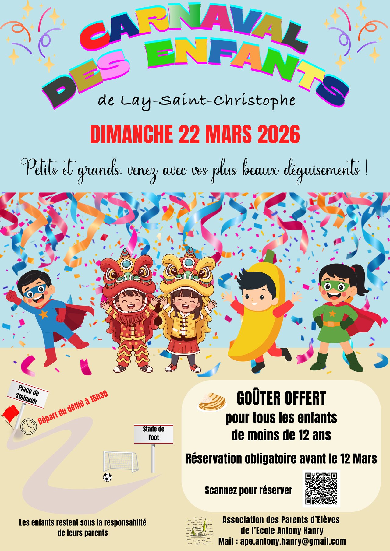 L’Association des Parents d'Élèves Antony Hanry est heureuse de vous convier au carnaval de Lay-Saint-Christophe qui se déroulera le dimanche 22 mars 2026 à 15h30.