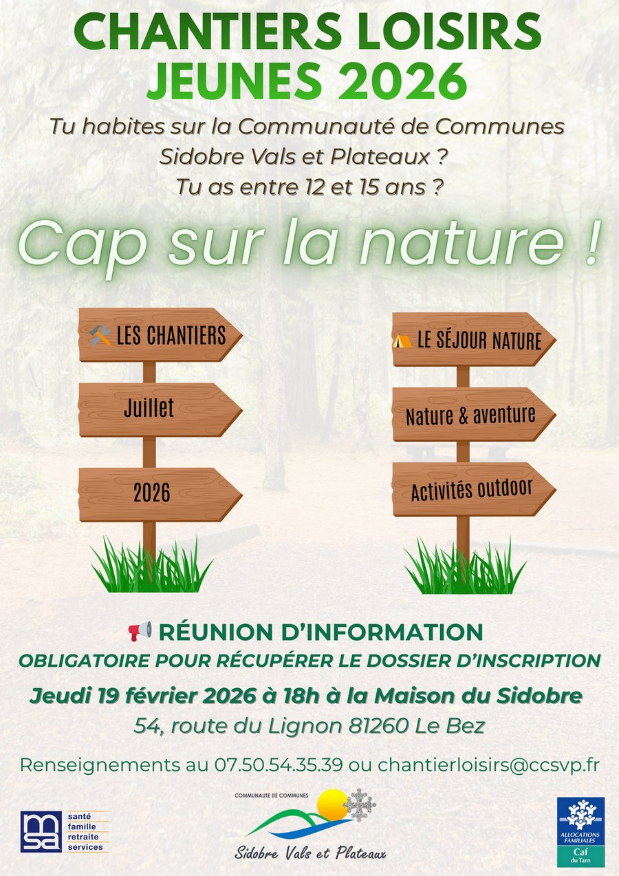 La communauté de communes relance le dispositif « chantiers loisirs jeunes » destinés aux enfants de 12 à 15 ans habitants la communauté de communes Sidobre Vals et Plateaux. En contrepartie d’actions permettant de mettre en valeur le patrimoine naturel, historique ou culturel du territoire, les jeunes partent quelques jours en séjour.