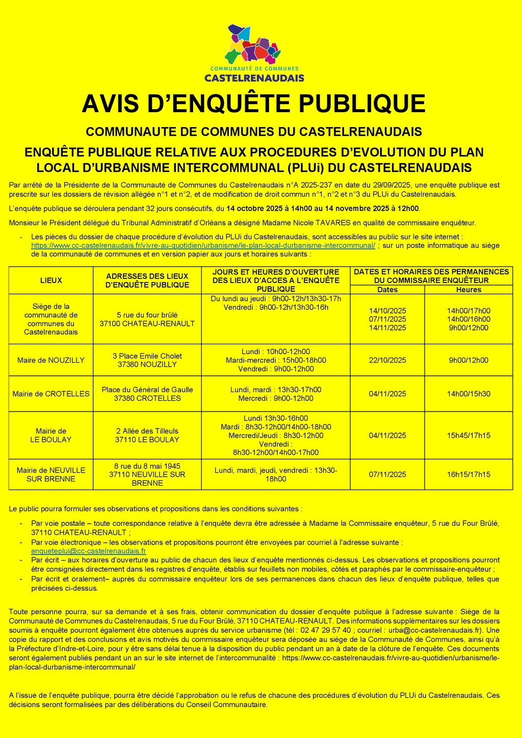 La communauté de communes réalisera une enquête relative aux procédures d'évolution du plan local d'urbanisme intercommunal du Castelrenaudais.
