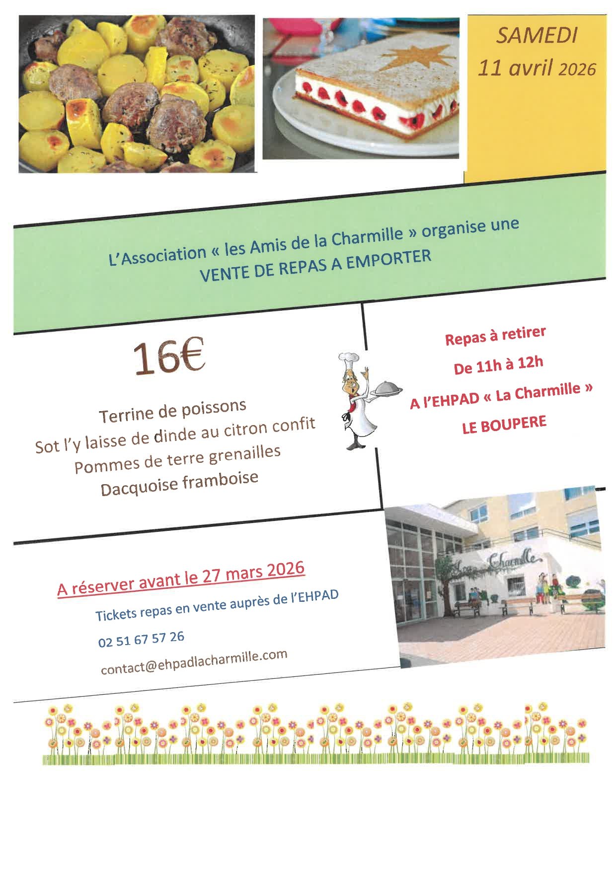 Les tickets repas sont en vente auprès de l'EHPAD au 02 51 67 57 26 ou contact@ehpadlacharmille.com