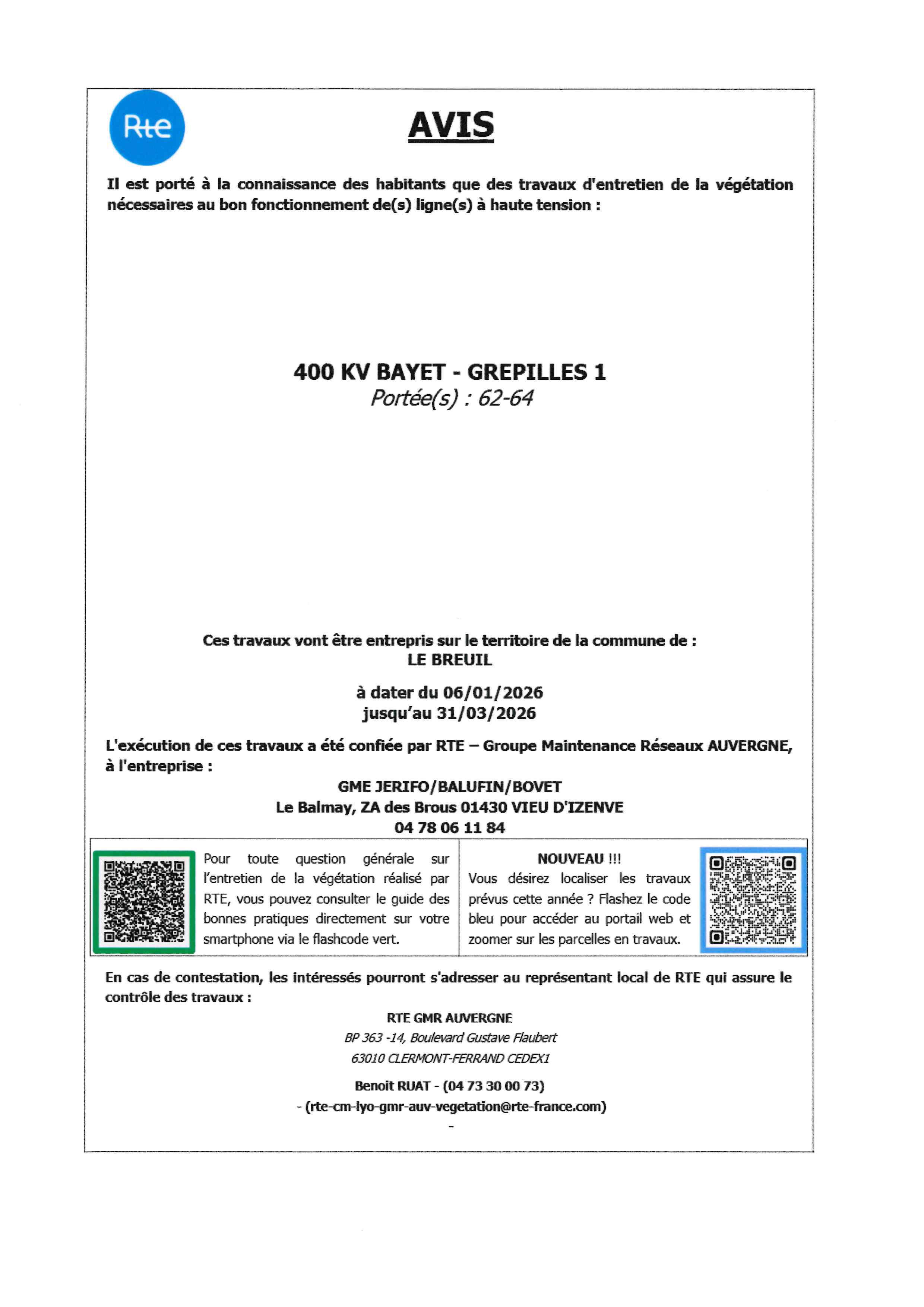 RTE nous informe que des travaux d'entretien de la végétation nécessaires au bon fonctionnement des lignes à haute tension seront réalisés à compter du 06/01/2025 jusqu'au 31/03/2026.