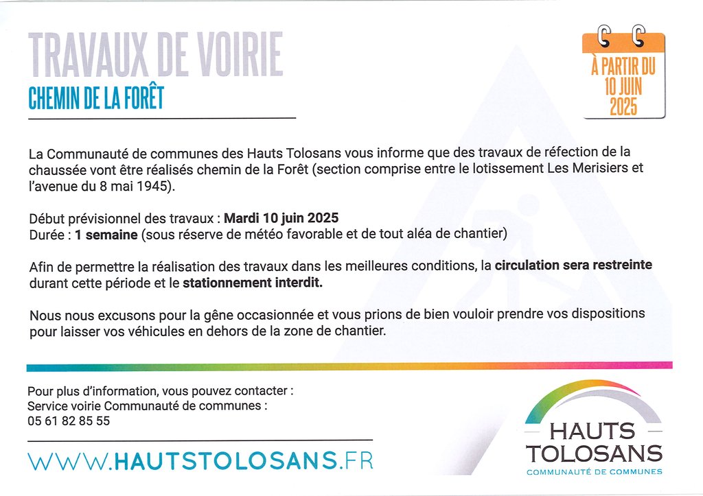 Les travaux de réfection de la chaussée, chemin de la forêt, débuteront le mardi 10 juin 2025.