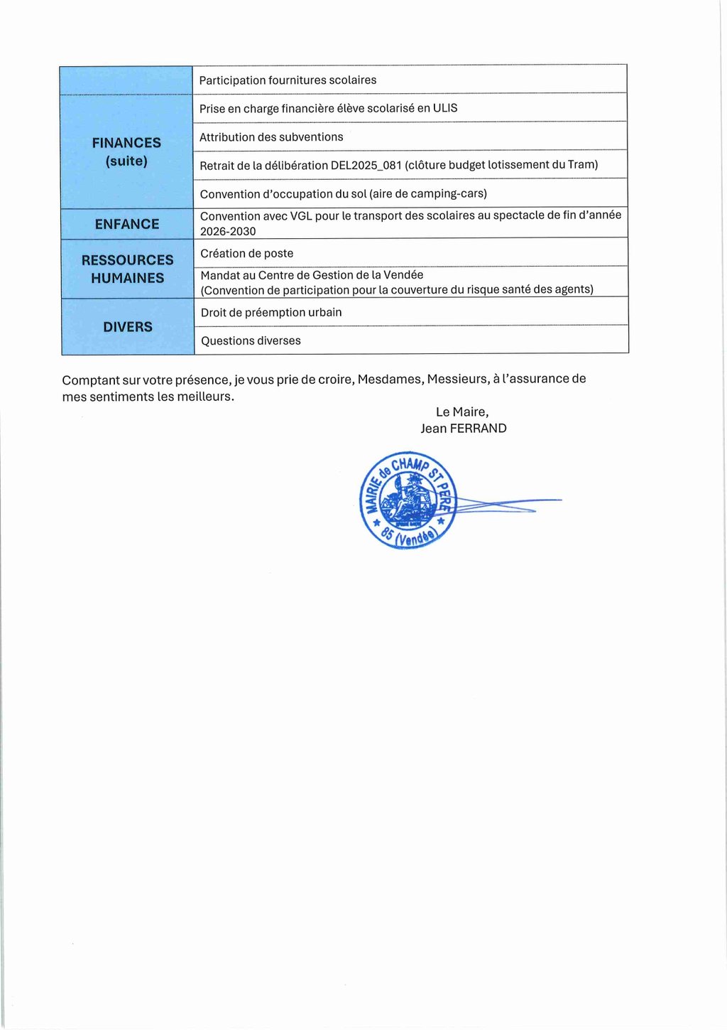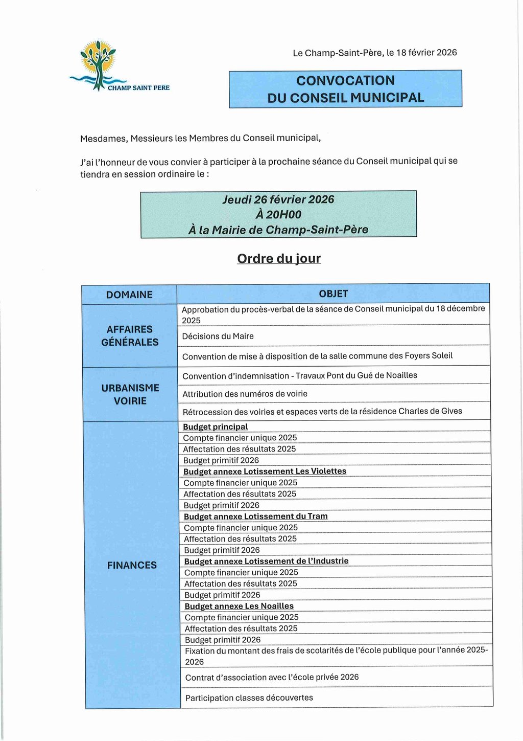 Réunion du Conseil Municipal du jeudi 26 février 2026 à 20h00 à la Mairie de Champ-saint-Père.