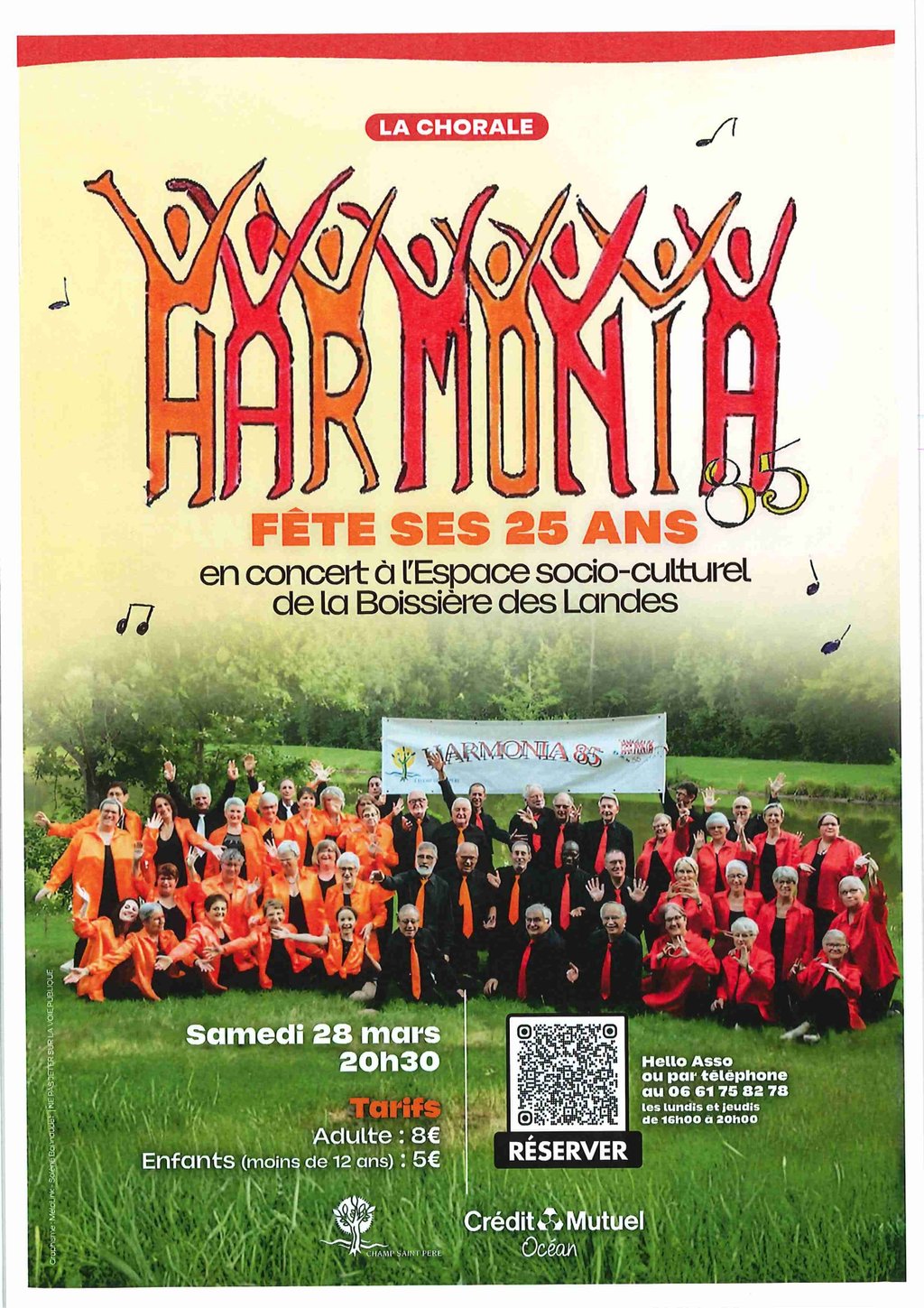 La Chorale Harmonia 85 fête ses 25 ans en concert à l'Espace socio-culturel de La Boissière des Landes le samedi 28 mars 2026 à 20h30.
