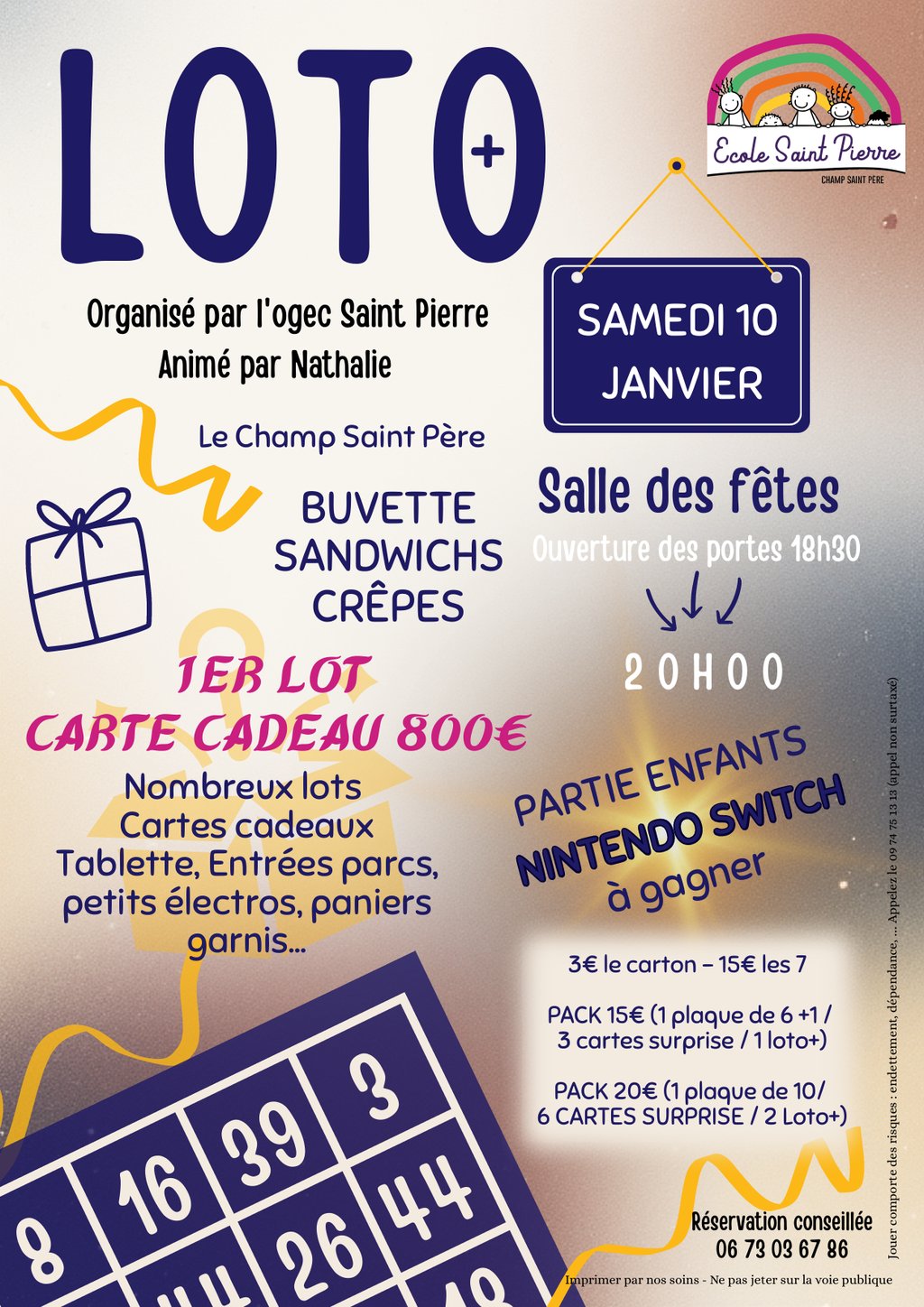 L'OGEC de l'École Saint Pierre organise son loto annuel à la salle Polyvalente de Champ Saint Père ! Venez passer un moment convivial en famille avec buvette et snack sur place et tenter de remporter de nombreux lots à gagner :