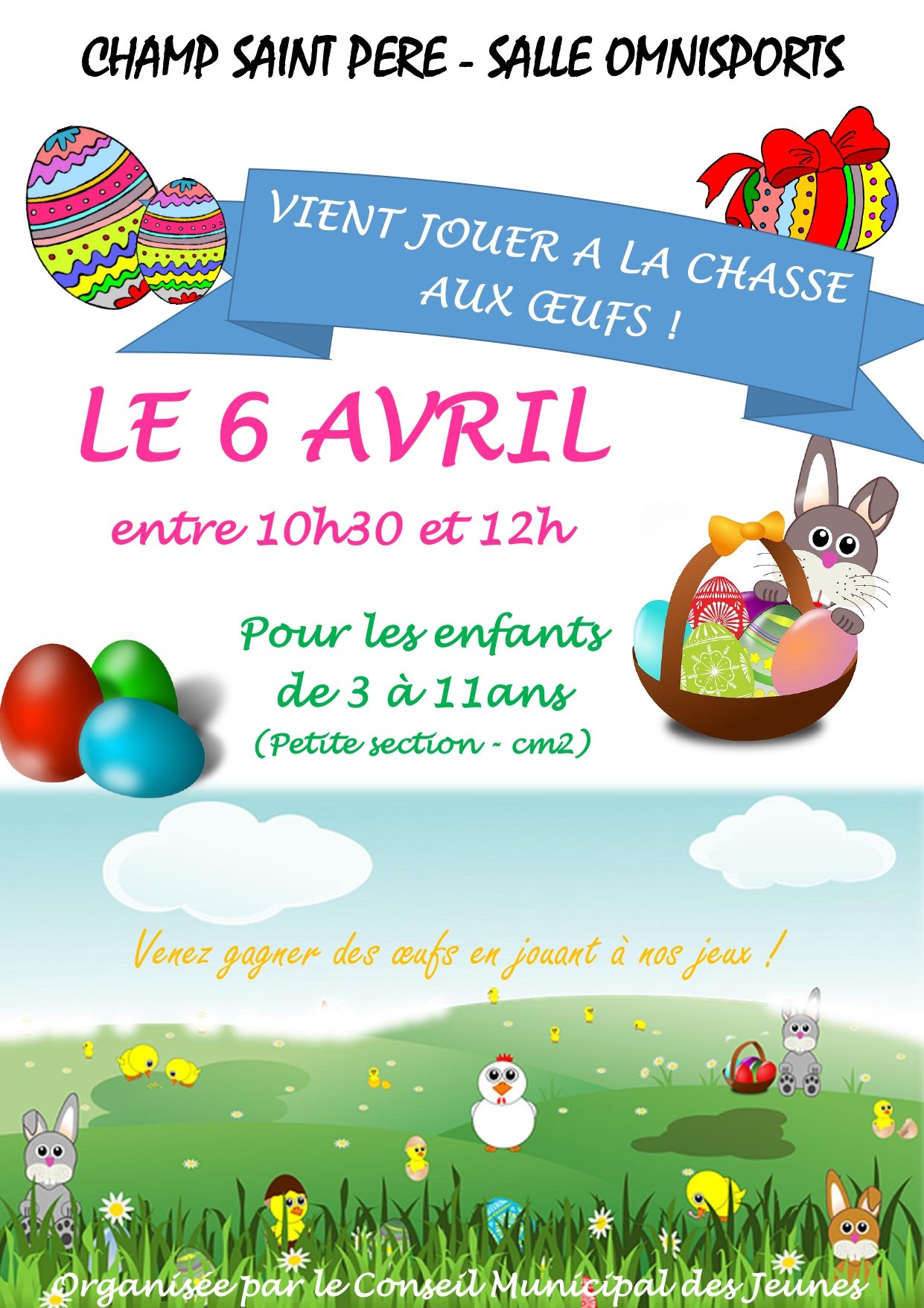 Vient jouer à la chasse aux œufs le lundi 6 avril 2026 de 10h30 à 12h00 à la Salle Omnisports de Champ-Saint-Père.