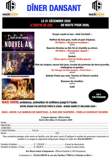 Soirée Réveillon du Nouvel An Maxi-Show : dîner dansant au Châtelet-en-Brie