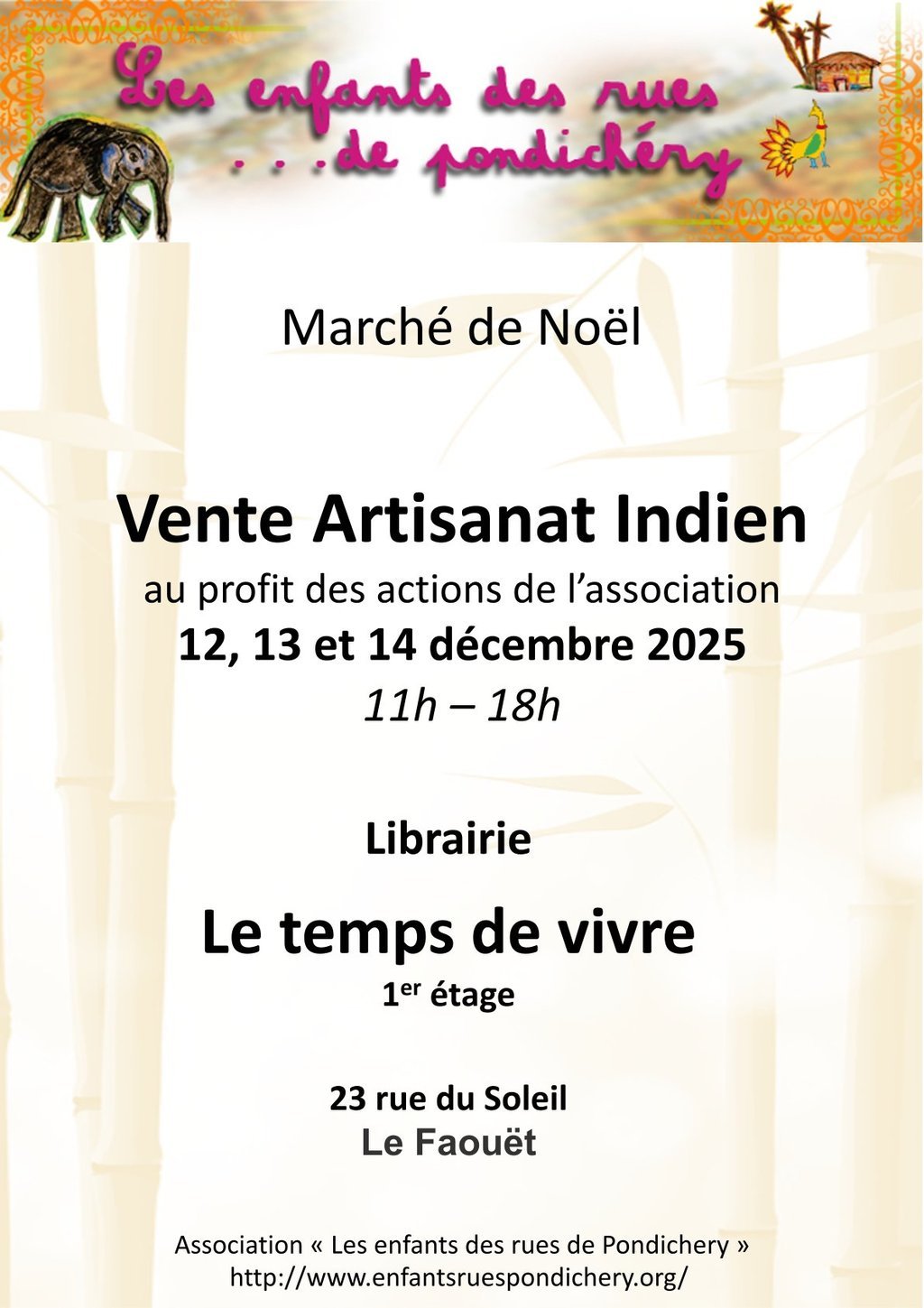 Vente solidaire. Seront proposés des produits artisanaux, ramenés de Pondichéry : écharpes, foulards en soie sauvage, pashmina, châle en cachemire, colliers et bracelets…