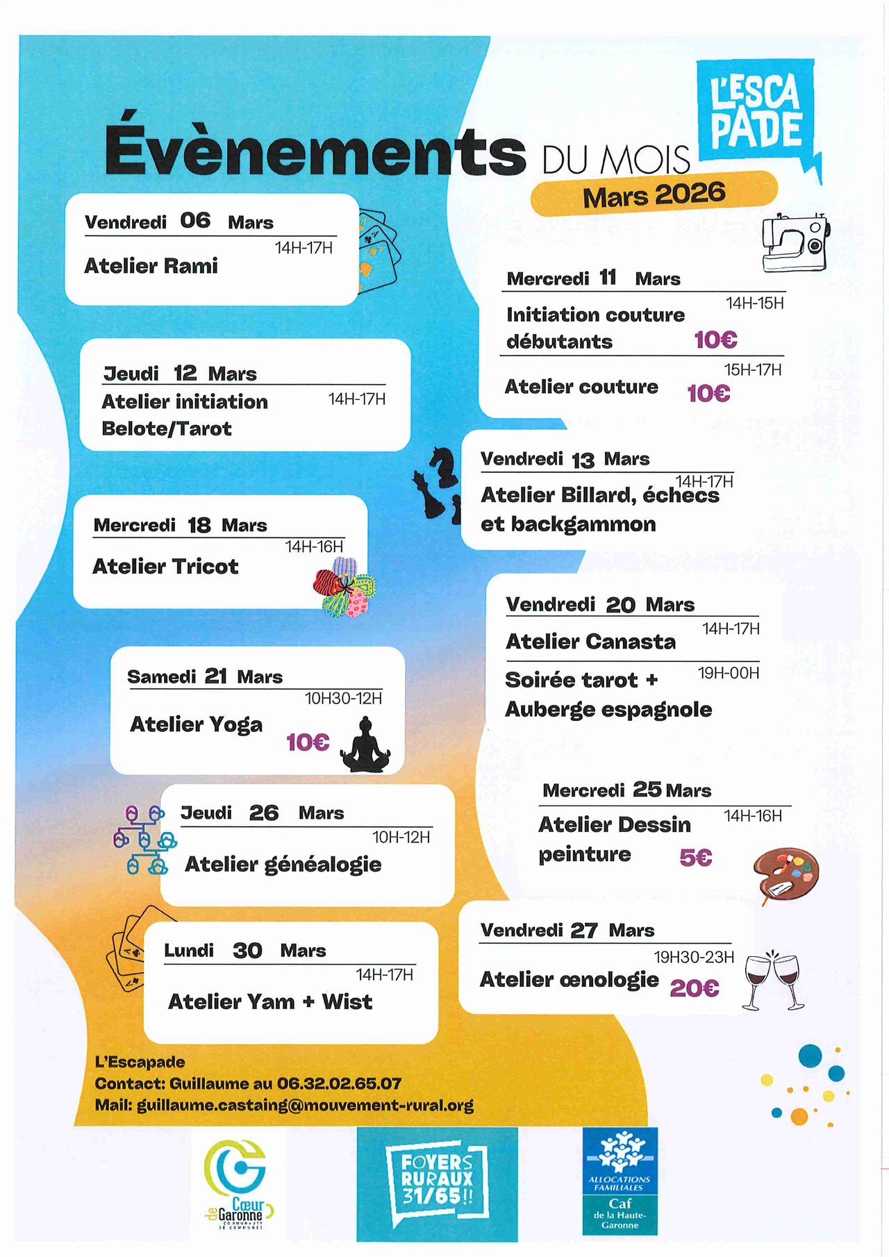 Bonjour à tous voici le programme du mois de Mars à l'escapade du Fousseret.
