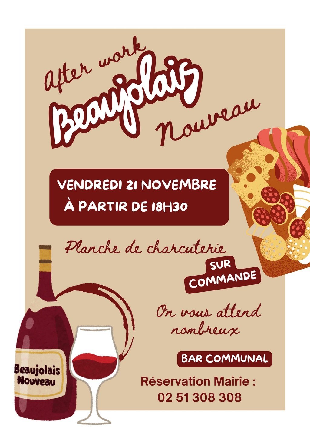 On vous attend nombreux , le Vendredi 21 Novembre à partir de 18.30 , pour déguster le Beaujolais Nouveau.