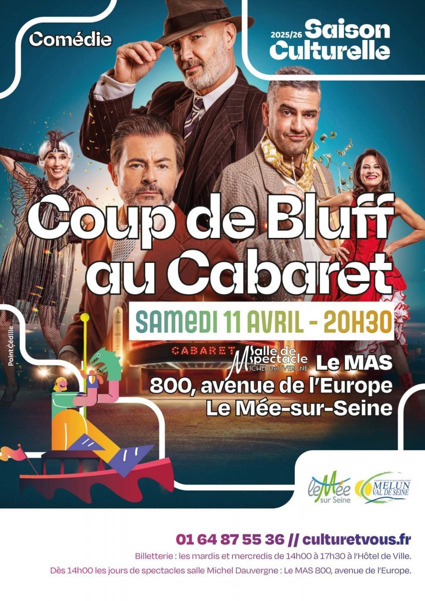 Coup de bluff au cabaret est une comédie hilarante qui se termine en apothéose par un vrai show cabaret mêlant chant, danse et féérie. Après de belles années de gloire, le cabaret des deux frères Claude (Jérôme Anthony) et Michaël (Nicolas Vitiello) est en faillite. Malgré l’aide de Celeste (Véronique Demonge), meneuse de revue à la retraite, ils peinent à redonner à l’établissement sa grandeur d’antan. Jusqu’au jour où Tonio (Frank Leboeuf), escroc recherché, décide par la force de s’y cacher pour réussir sa cavale. Quoi de mieux que ce cabaret miteux déserté par le public pour mener à bien sa planque ? Lorsque la police débarque (Christine Lemler), tout ce joli monde va tenter de jouer un rôle pour cacher les secrets de chacun. Mais aucun n’imaginera qu’entre jeux de rôles, coups de bluff et quiproquos, l’énorme vérité qui va éclater pourra enfin sauver le cabaret !