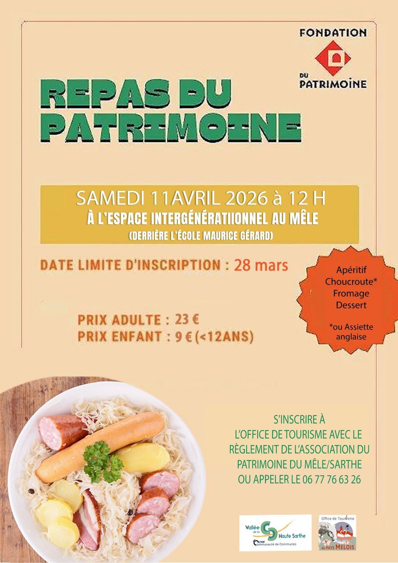 Repas du patrimoine samedi 11 avril à 12h00 à l'espace intergénérationnel derrière l'école Maurice Gérard. Réservations avant le 28 mars à l'office de tourisme et au 06 77 76 63 26