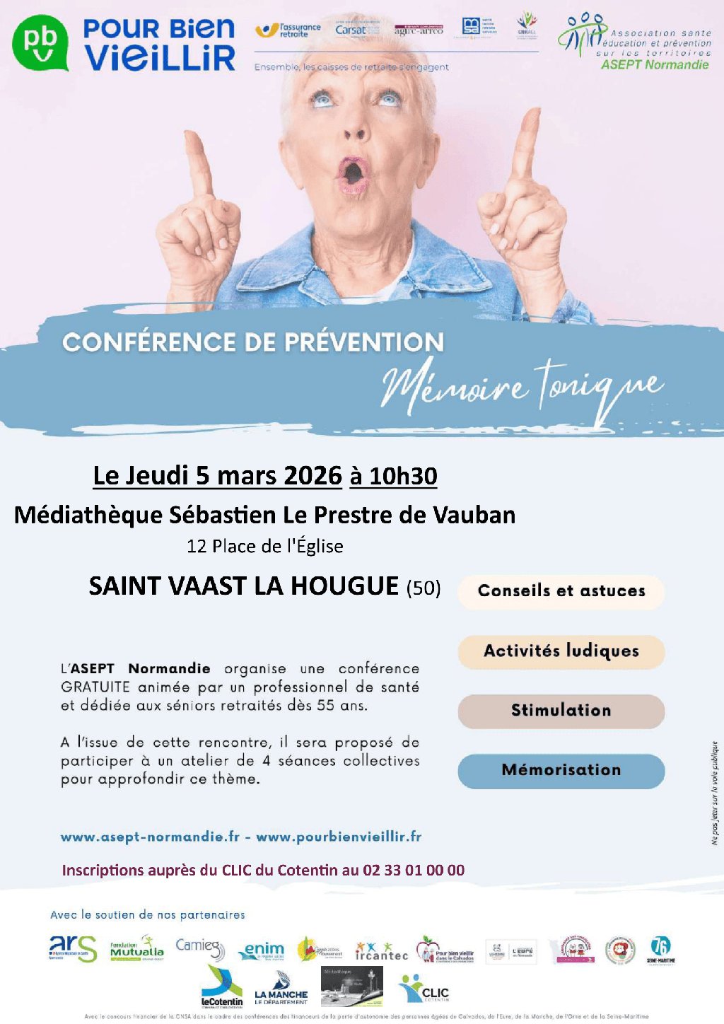 Le jeudi 5 mars à 10h30, conférence « mémoire tonique » avec l’ASEPT Normandie et la médiathèque de Saint-Vaast-la-Hougue. Des questions sur la mémoire, son fonctionnement, son entretien… Cette conférence sera suivie de 4 ateliers sur inscription le jour même. Pour les 60 ans et plus, gratuit Renseignement et inscription obligatoire au 02 33 01 00 00