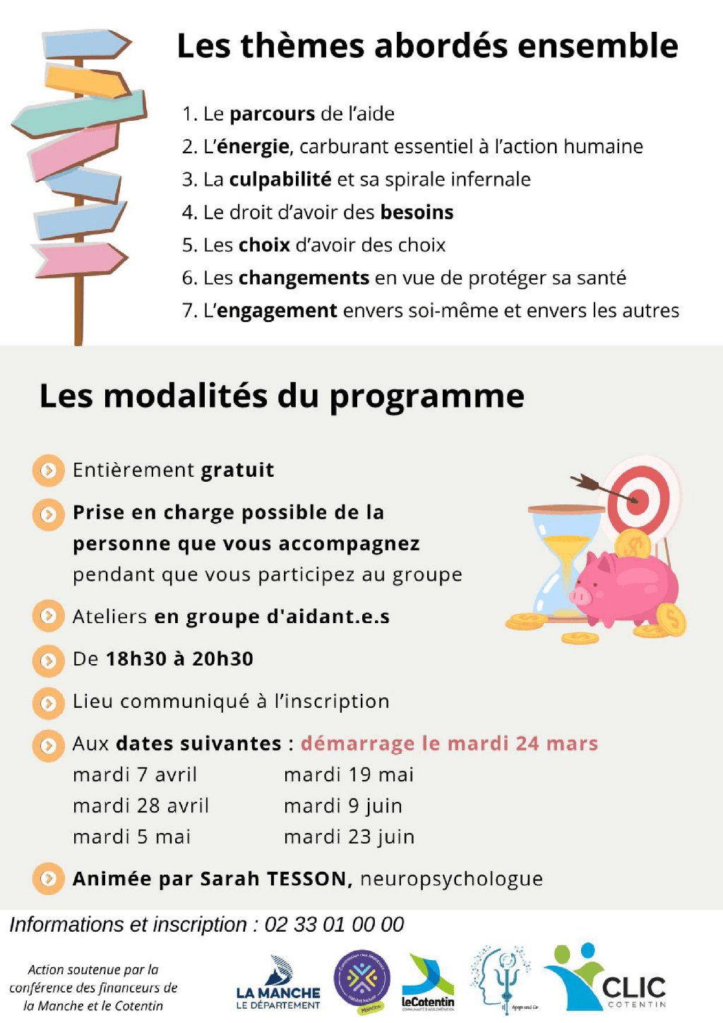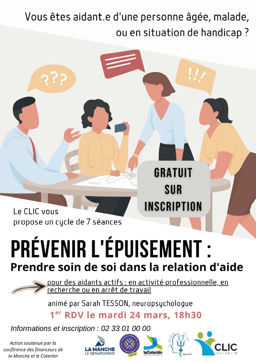« Prévenir l’épuisement : prendre soin de soi dans la relation d’aide » formation proposée par le CLIC et animée par une neuropsychologue sur 7 séances, à partir du 24 mars, 18h30-20h30, pour les aidants actifs (qui travaillent, qui cherchent du travail ou sont en arrêt). Solution de suppléance possible si besoin, à prévoir à l’inscription. Lieu à définir selon les inscrits. Gratuit, pour les aidants actifs (qui travaillent, qui cherchent du travail ou sont en arrêt) Sur inscription obligatoire au 02 33 01 00 00 ou par mail contact@clicducotentin.fr